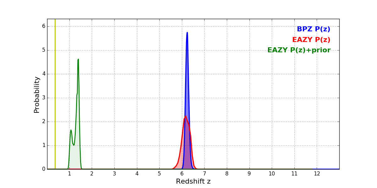 In P(z) plots: Yellow lines mark the cluster redshift z = 0.356,