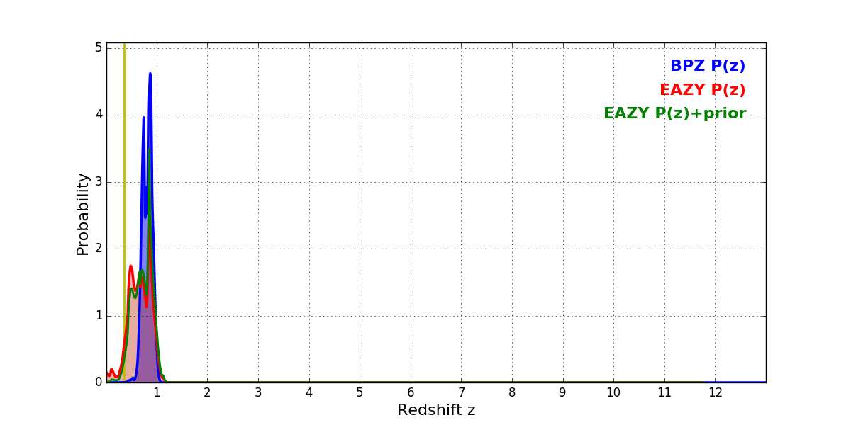 In P(z) plots: Yellow lines mark the cluster redshift z = 0.356,