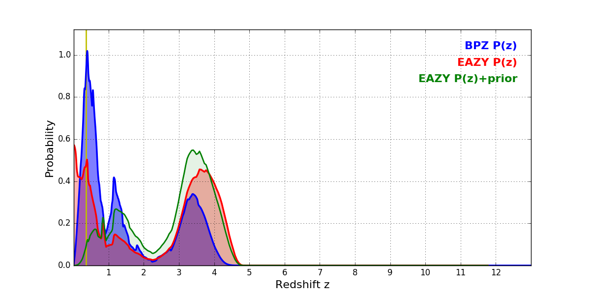 In P(z) plots: Yellow lines mark the cluster redshift z = 0.356,