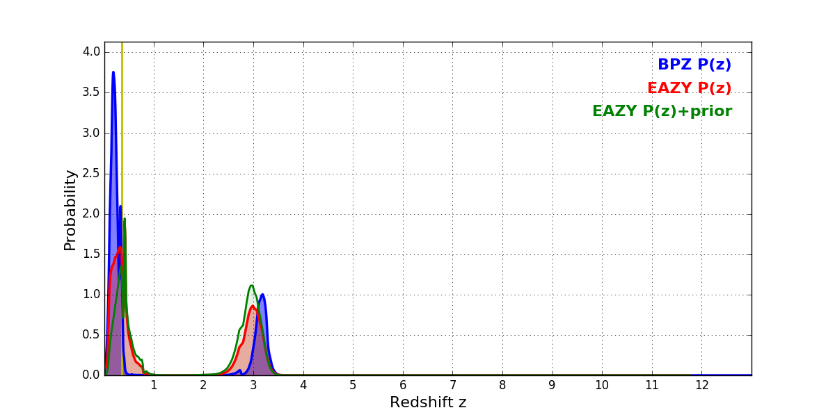 In P(z) plots: Yellow lines mark the cluster redshift z = 0.356,