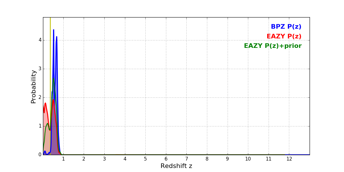 In P(z) plots: Yellow lines mark the cluster redshift z = 0.356,