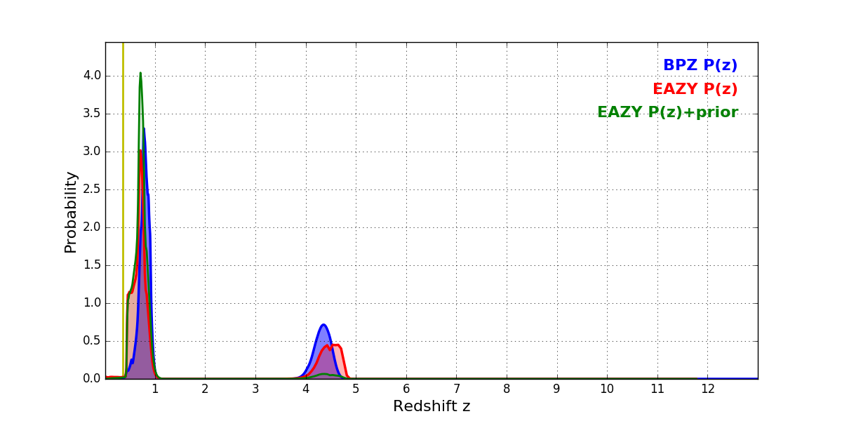 In P(z) plots: Yellow lines mark the cluster redshift z = 0.356,