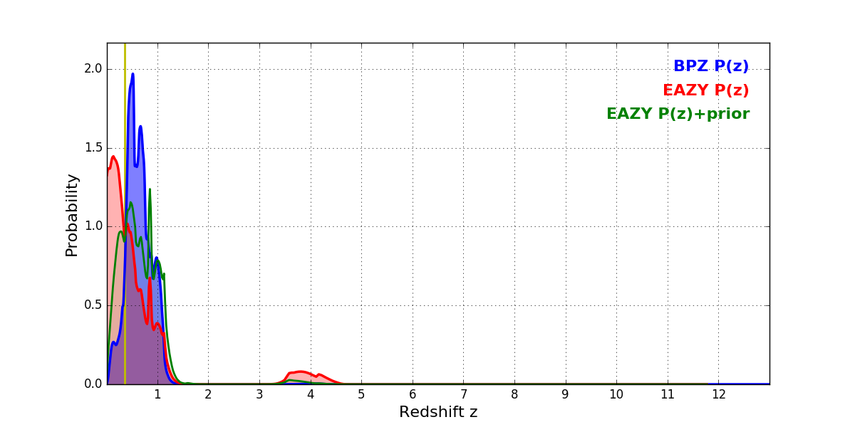 In P(z) plots: Yellow lines mark the cluster redshift z = 0.356,