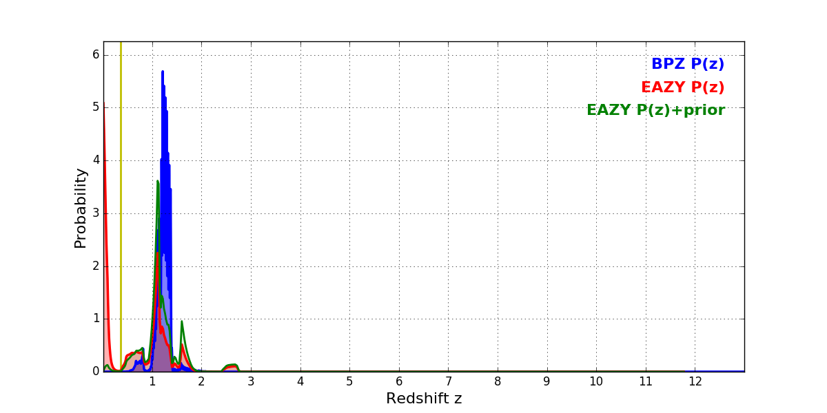 In P(z) plots: Yellow lines mark the cluster redshift z = 0.356,