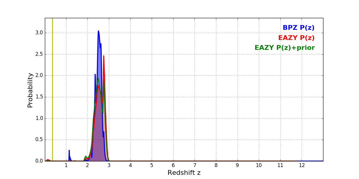 In P(z) plots: Yellow lines mark the cluster redshift z = 0.356,