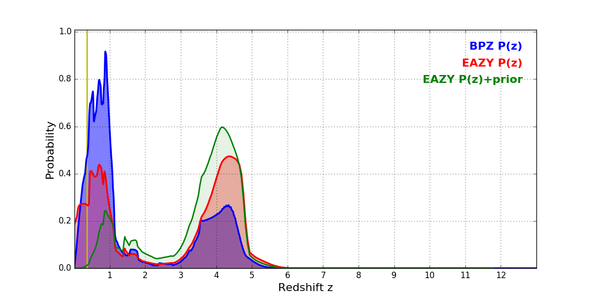 In P(z) plots: Yellow lines mark the cluster redshift z = 0.356,