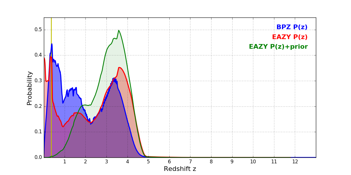 In P(z) plots: Yellow lines mark the cluster redshift z = 0.356,