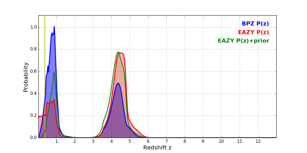 In P(z) plots: Yellow lines mark the cluster redshift z = 0.356,