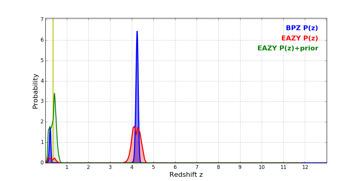 In P(z) plots: Yellow lines mark the cluster redshift z = 0.356,