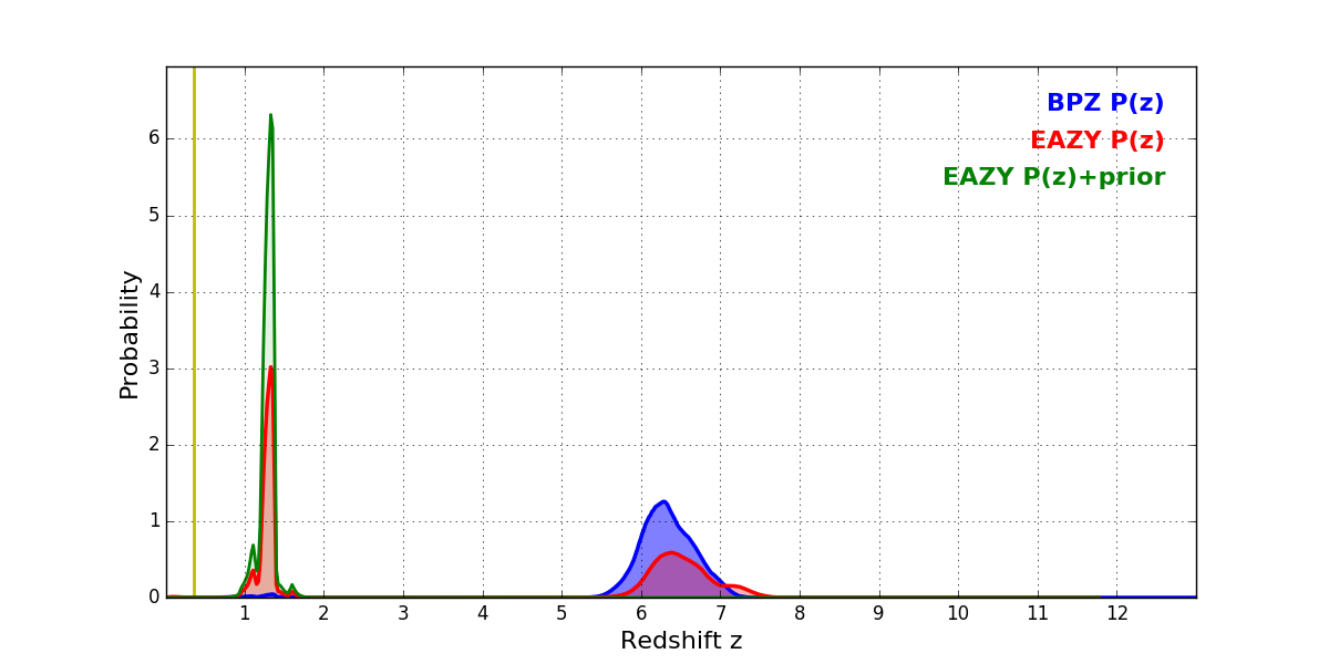 In P(z) plots: Yellow lines mark the cluster redshift z = 0.356,