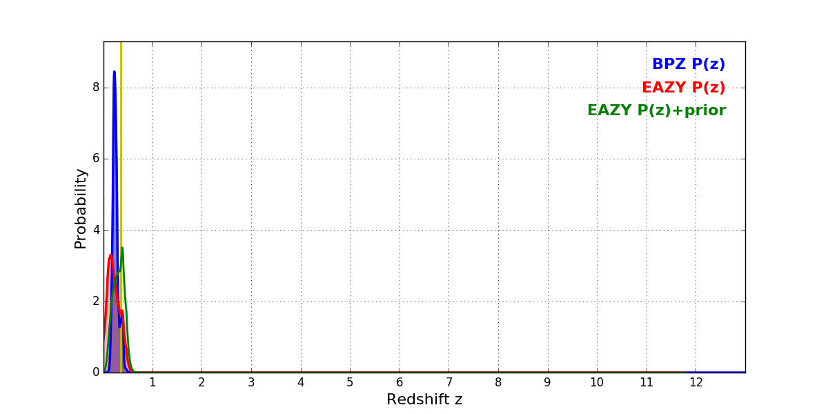 In P(z) plots: Yellow lines mark the cluster redshift z = 0.356,
