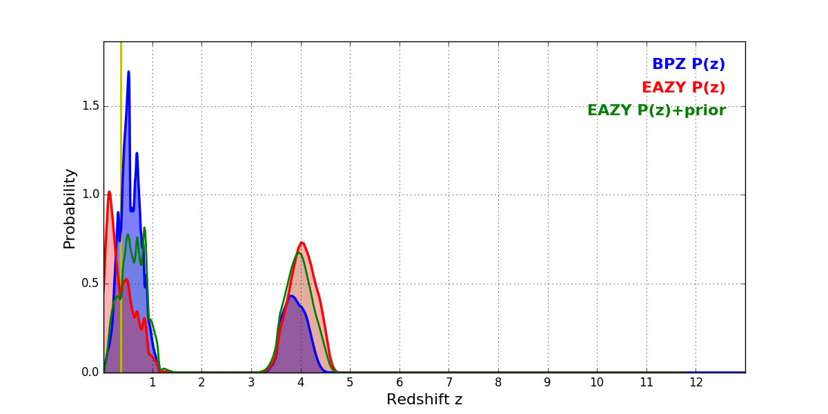 In P(z) plots: Yellow lines mark the cluster redshift z = 0.356,