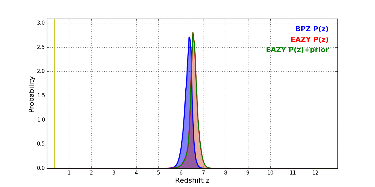 In P(z) plots: Yellow lines mark the cluster redshift z = 0.356,