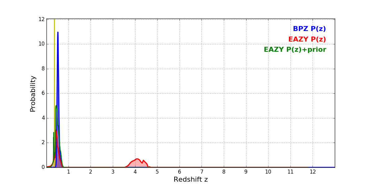 In P(z) plots: Yellow lines mark the cluster redshift z = 0.356,