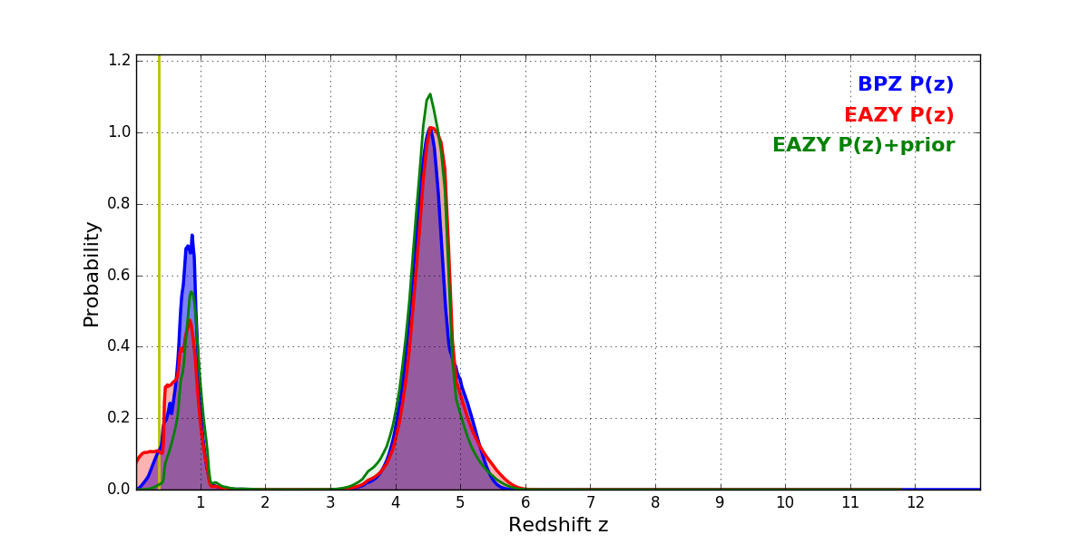 In P(z) plots: Yellow lines mark the cluster redshift z = 0.356,
