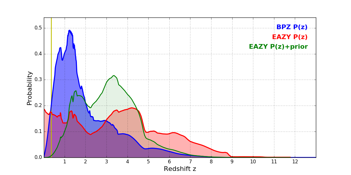 In P(z) plots: Yellow lines mark the cluster redshift z = 0.356,