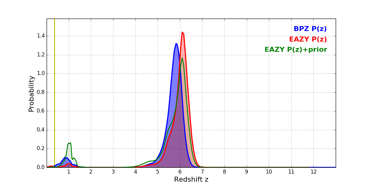 In P(z) plots: Yellow lines mark the cluster redshift z = 0.356,
