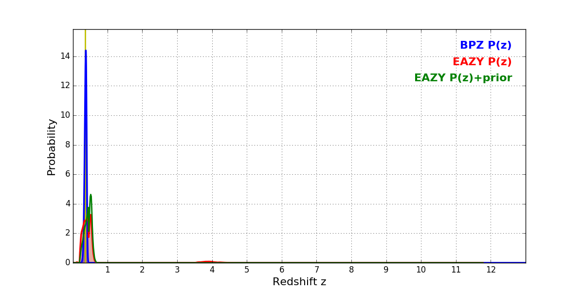 In P(z) plots: Yellow lines mark the cluster redshift z = 0.356,