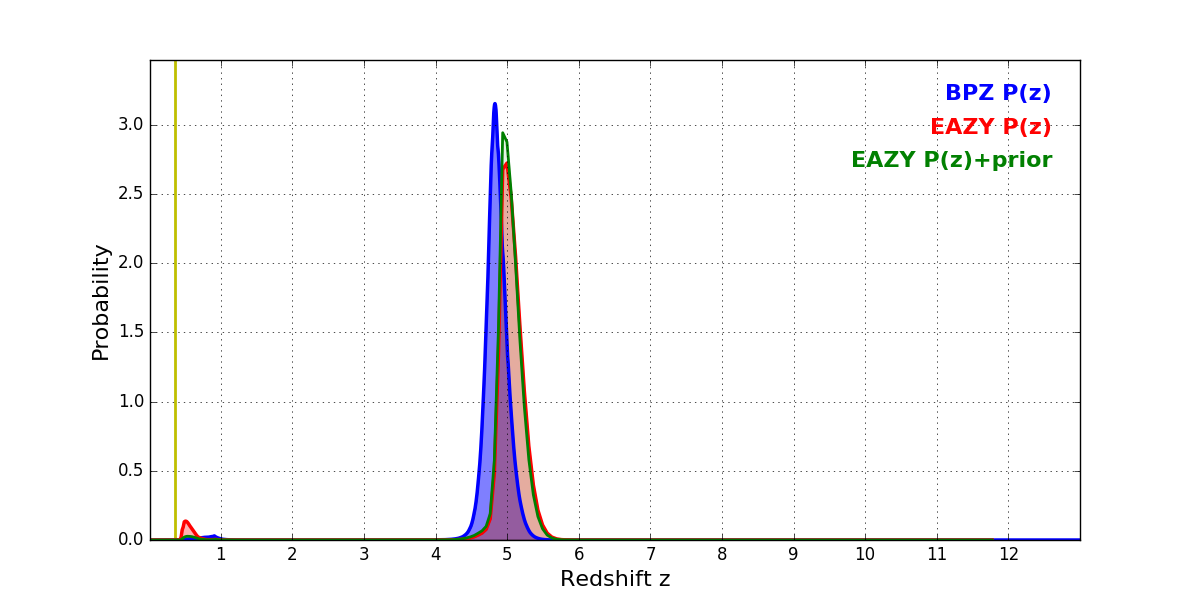 In P(z) plots: Yellow lines mark the cluster redshift z = 0.356,
