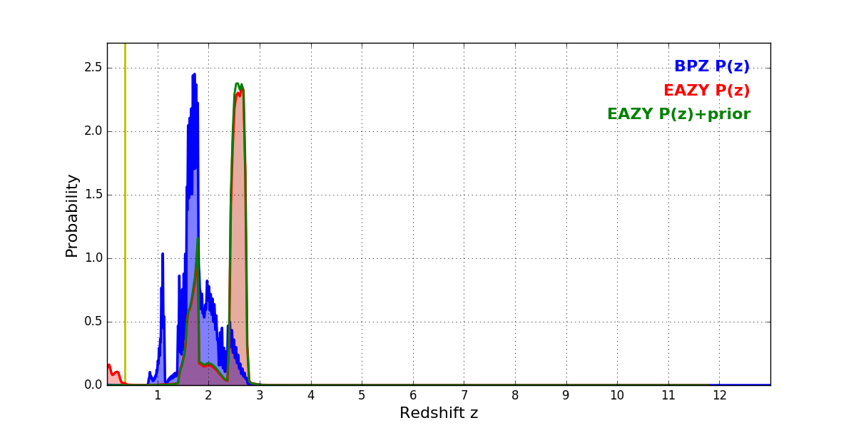 In P(z) plots: Yellow lines mark the cluster redshift z = 0.356,