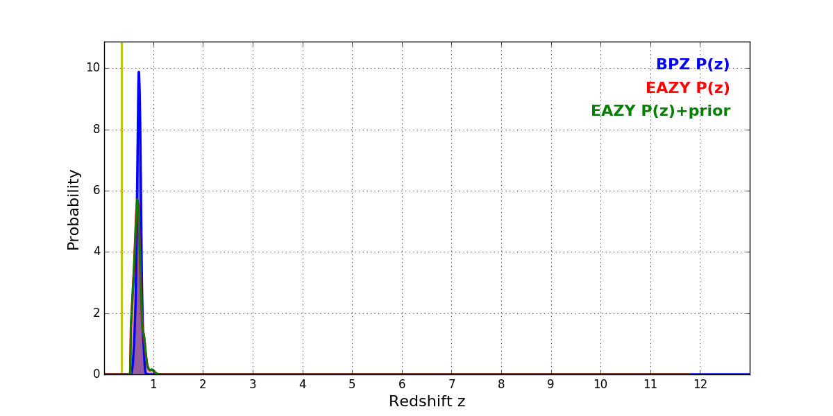In P(z) plots: Yellow lines mark the cluster redshift z = 0.356,
