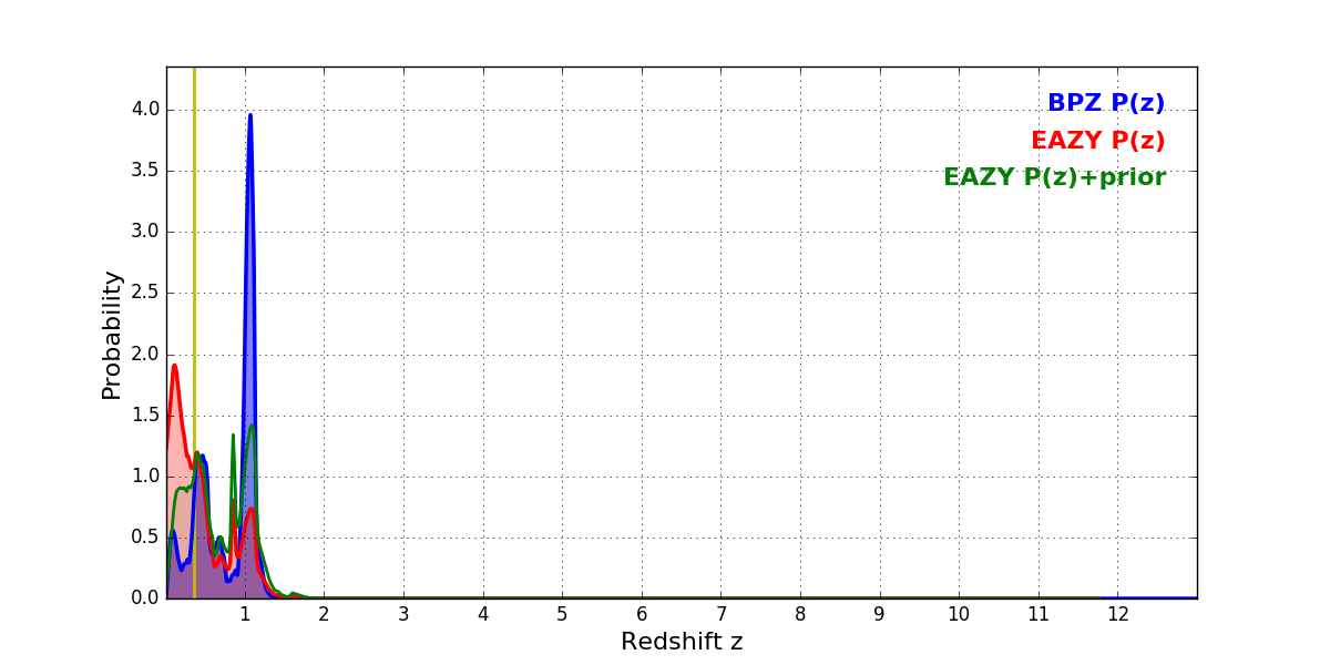 In P(z) plots: Yellow lines mark the cluster redshift z = 0.356,