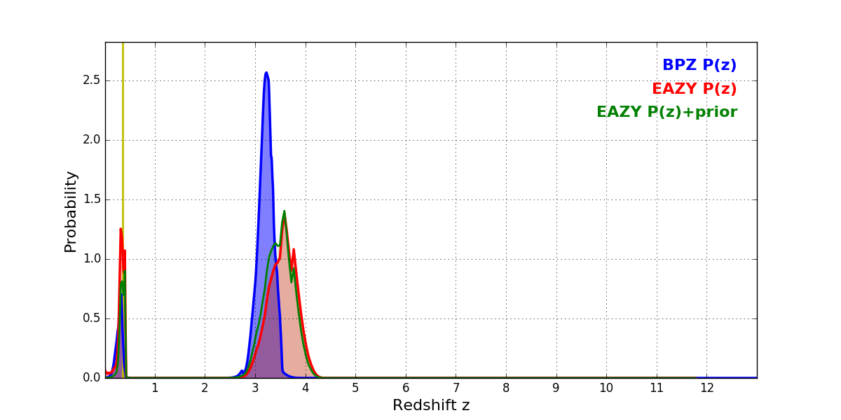 In P(z) plots: Yellow lines mark the cluster redshift z = 0.356,