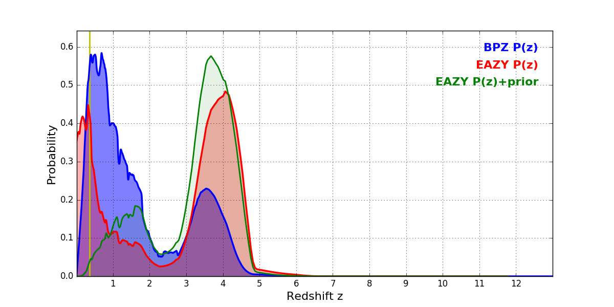 In P(z) plots: Yellow lines mark the cluster redshift z = 0.356,