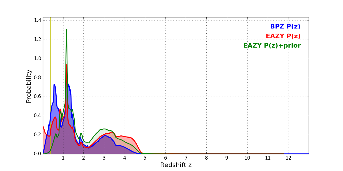 In P(z) plots: Yellow lines mark the cluster redshift z = 0.356,