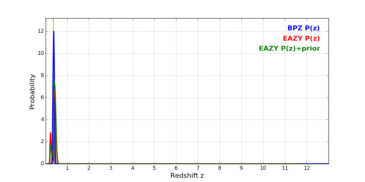 In P(z) plots: Yellow lines mark the cluster redshift z = 0.356,
