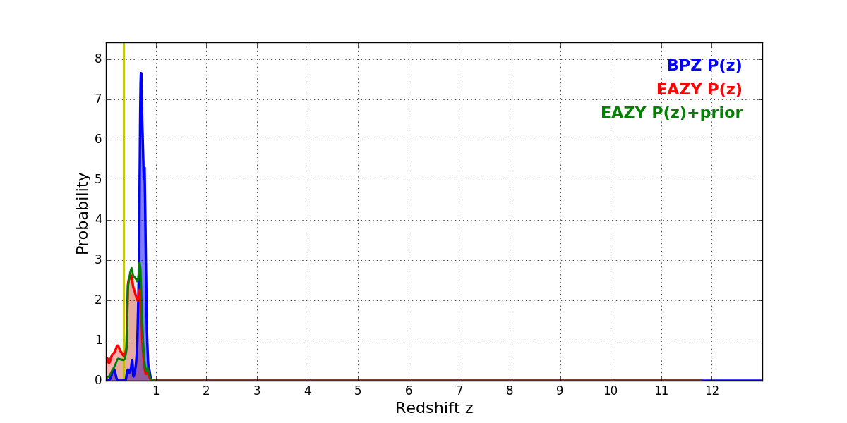 In P(z) plots: Yellow lines mark the cluster redshift z = 0.356,
