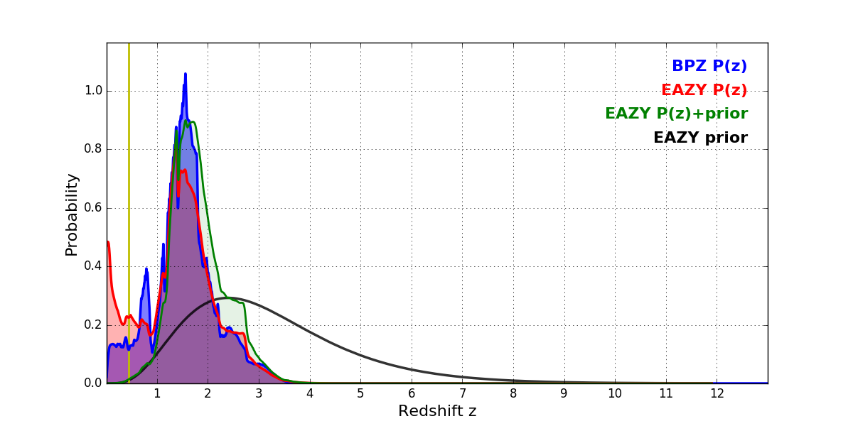 In P(z) plots: Yellow lines mark the cluster redshift z = 0.443,