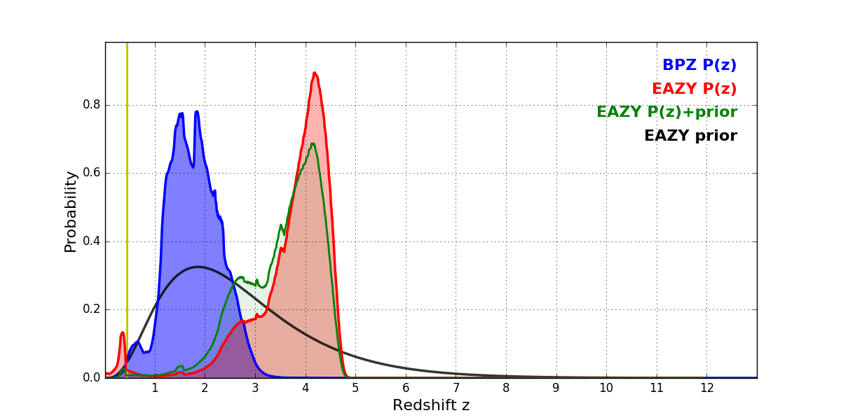 In P(z) plots: Yellow lines mark the cluster redshift z = 0.443,