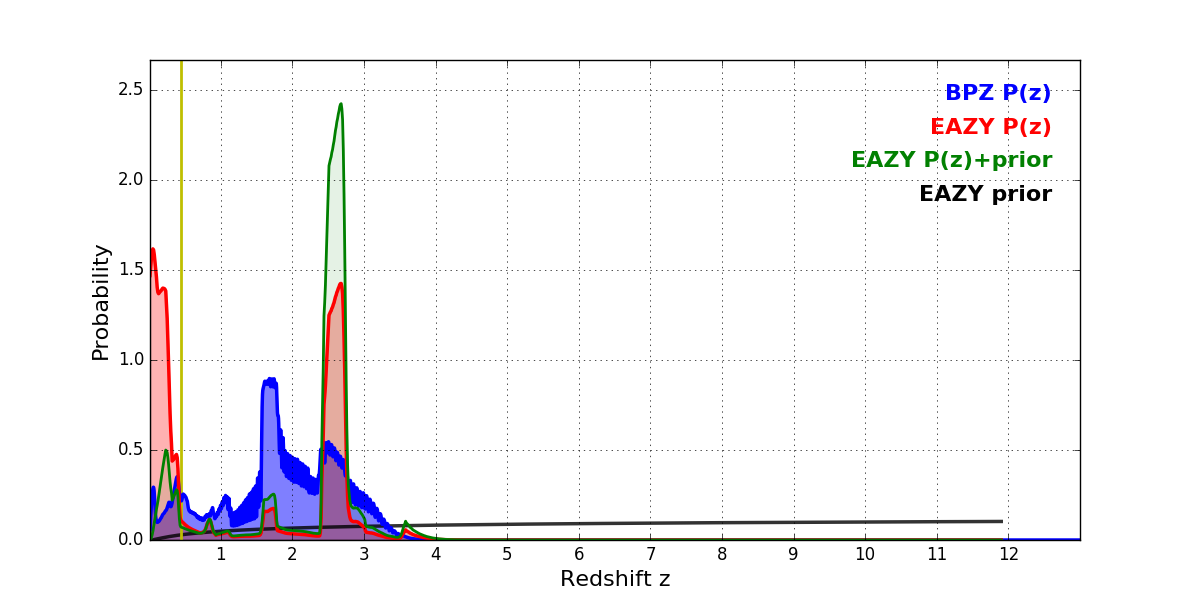 In P(z) plots: Yellow lines mark the cluster redshift z = 0.443,