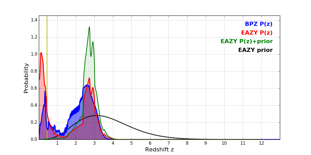 In P(z) plots: Yellow lines mark the cluster redshift z = 0.443,