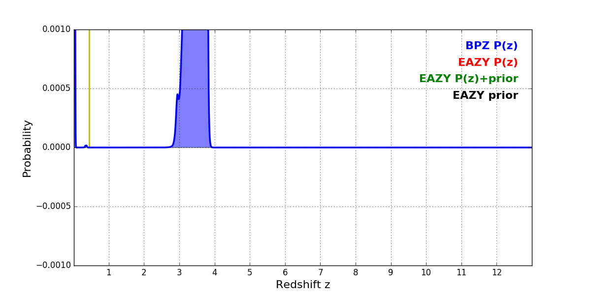 In P(z) plots: Yellow lines mark the cluster redshift z = 0.443,
