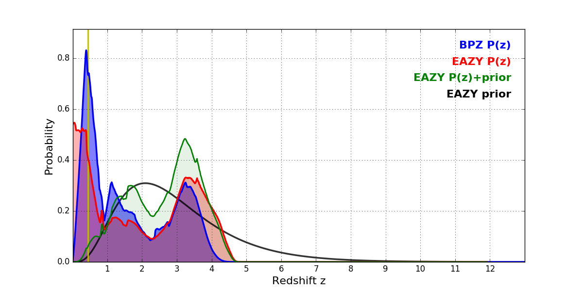 In P(z) plots: Yellow lines mark the cluster redshift z = 0.443,