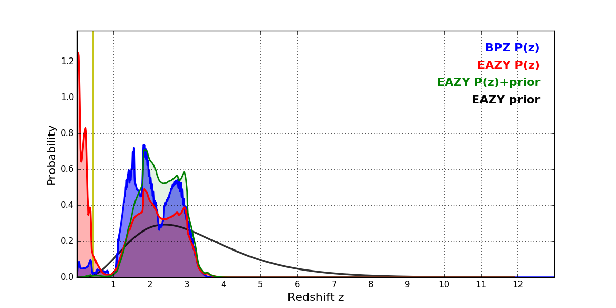 In P(z) plots: Yellow lines mark the cluster redshift z = 0.443,