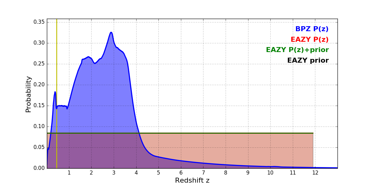 In P(z) plots: Yellow lines mark the cluster redshift z = 0.443,