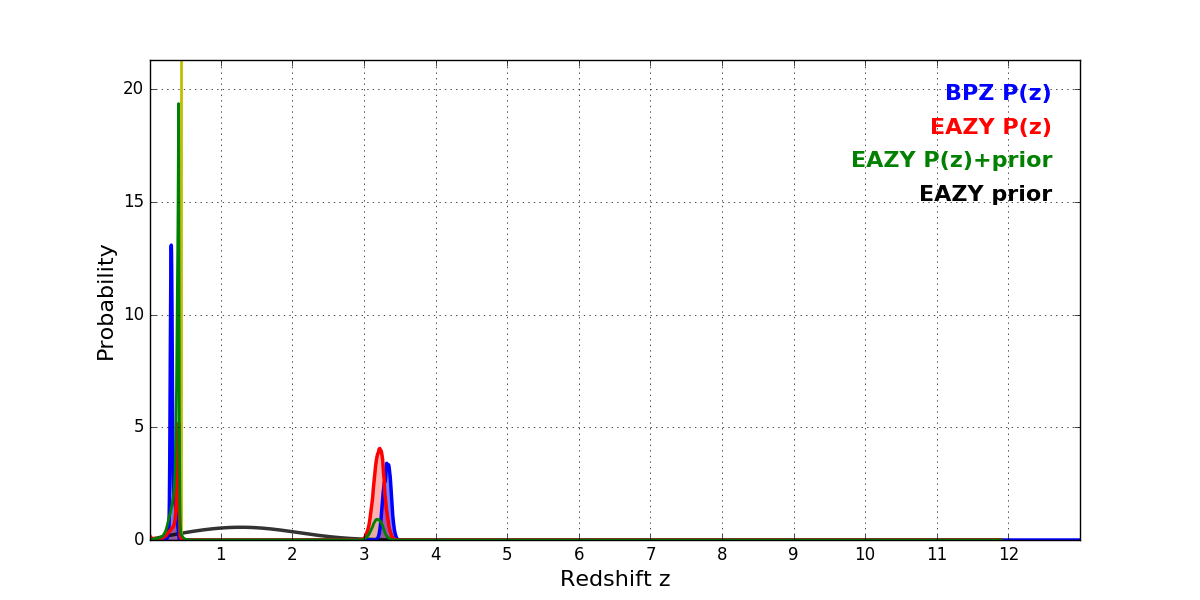In P(z) plots: Yellow lines mark the cluster redshift z = 0.443,