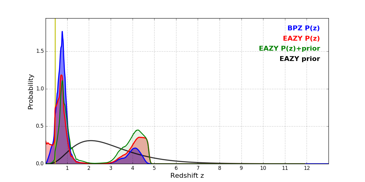 In P(z) plots: Yellow lines mark the cluster redshift z = 0.443,