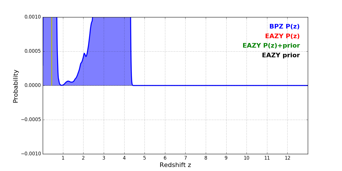In P(z) plots: Yellow lines mark the cluster redshift z = 0.443,