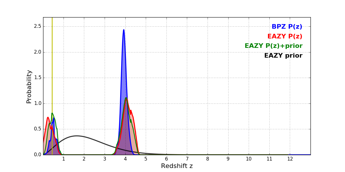 In P(z) plots: Yellow lines mark the cluster redshift z = 0.443,