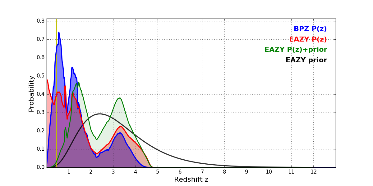 In P(z) plots: Yellow lines mark the cluster redshift z = 0.443,