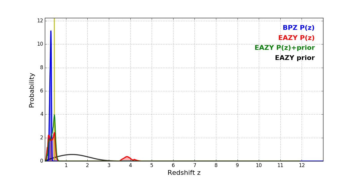 In P(z) plots: Yellow lines mark the cluster redshift z = 0.443,