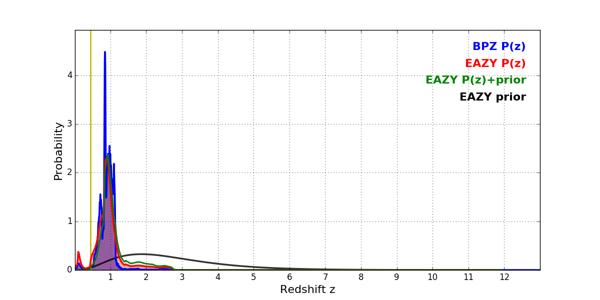 In P(z) plots: Yellow lines mark the cluster redshift z = 0.443,