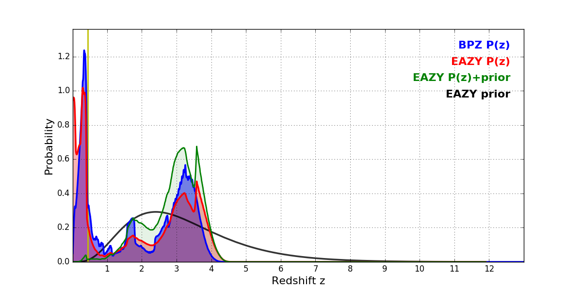 In P(z) plots: Yellow lines mark the cluster redshift z = 0.443,