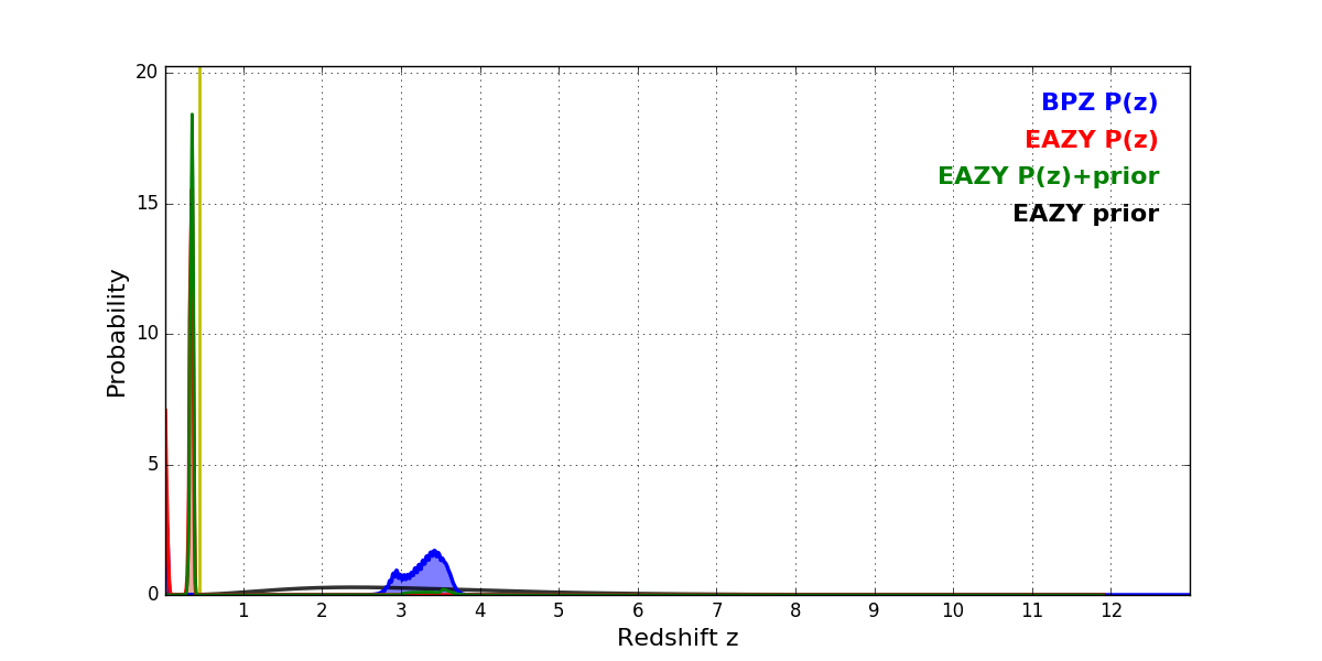 In P(z) plots: Yellow lines mark the cluster redshift z = 0.443,