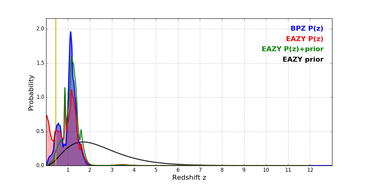 In P(z) plots: Yellow lines mark the cluster redshift z = 0.443,