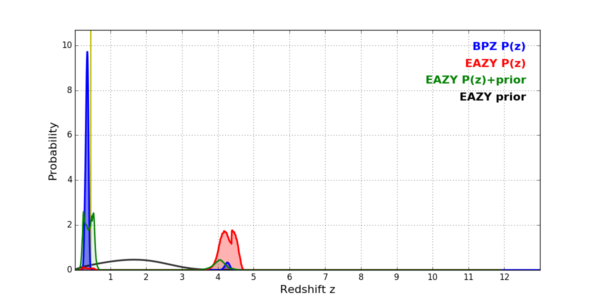 In P(z) plots: Yellow lines mark the cluster redshift z = 0.443,